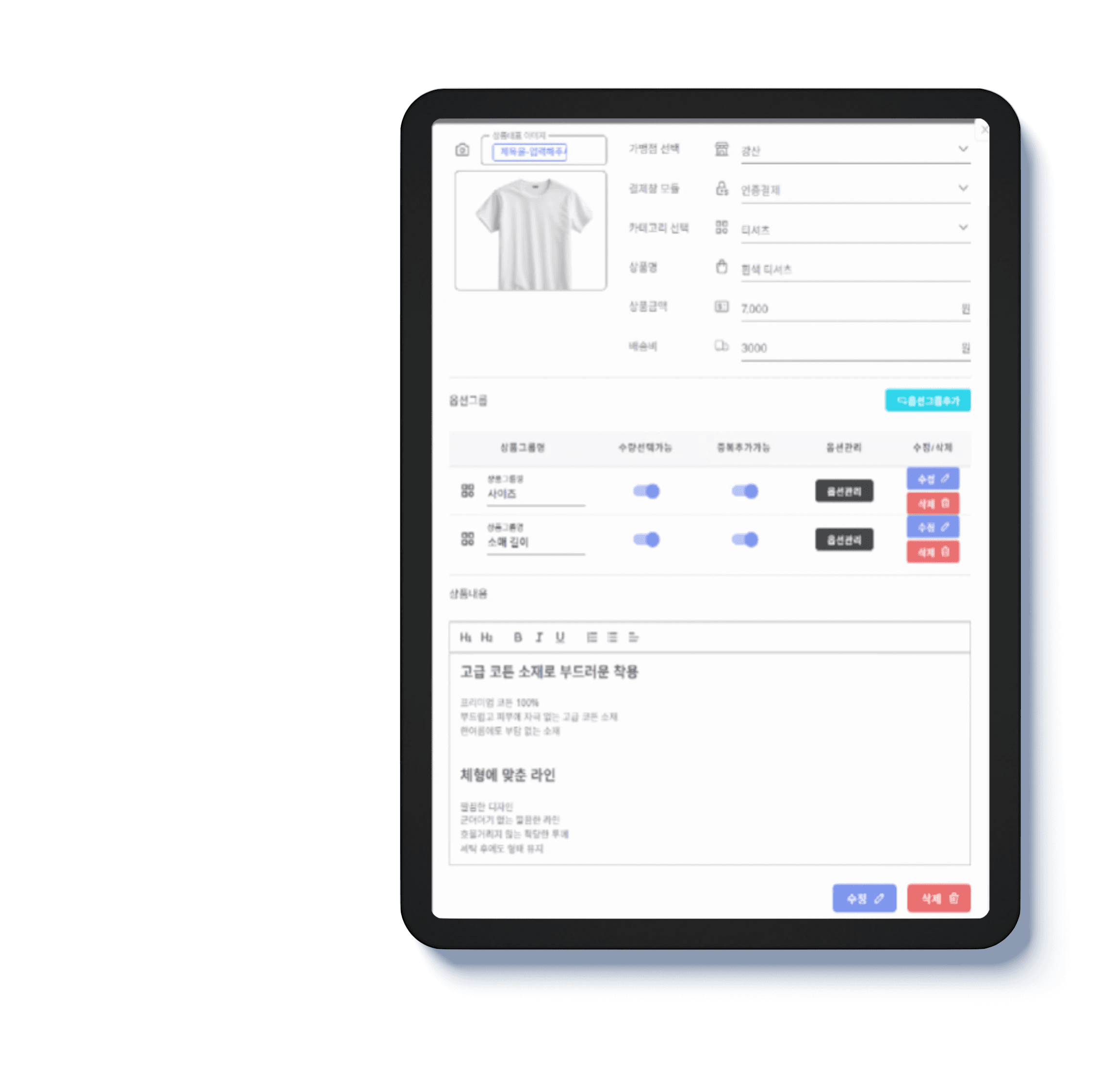 상품 이미지부터 상품 정보까지 판매에 필요한 모든 것을